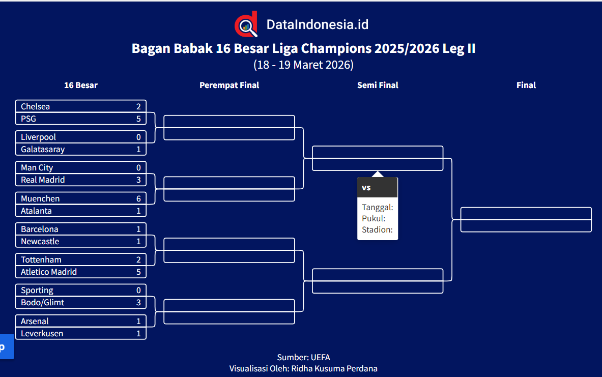Pertandingan leg kedua babak 16 besar Liga Champions musim 2025/2026 akan berlangsung pada 18–19 Maret 2026. Sebanyak delapan pertandingan telah dijadwalkan, dengan Sporting CP melawan Bodø/Glimt menjadi laga pembuka pada Rabu (18/3) pukul 00.45 WIB. Berikut jadwal lengkapnya.