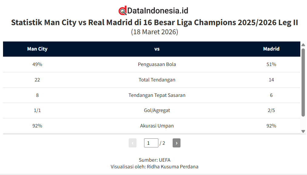 Real Madrid meraih kemenangan 2-1 atas Manchester City pada leg II babak 16 besar Liga Champions 2025/2026. Laga yang berlangsung di markas Man City itu memastikan Los Blancos melaju ke perempat final dengan keunggulan agregat 5-1. Berikut statistik pertandingan Man City vs Madrid.