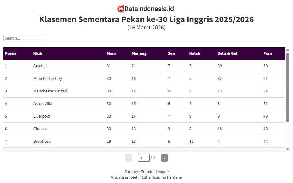 Arsenal masih memimpin klasemen sementara Liga Inggris 2025/2026 setelah rangkaian pertandingan pekan ke-30. Kemenangan 2–0 atas Everton pada laga Minggu (15/3) membuat The Gunners tetap kokoh di puncak klasemen sekaligus menjaga jarak dari pesaing terdekatnya, Manchester City.
