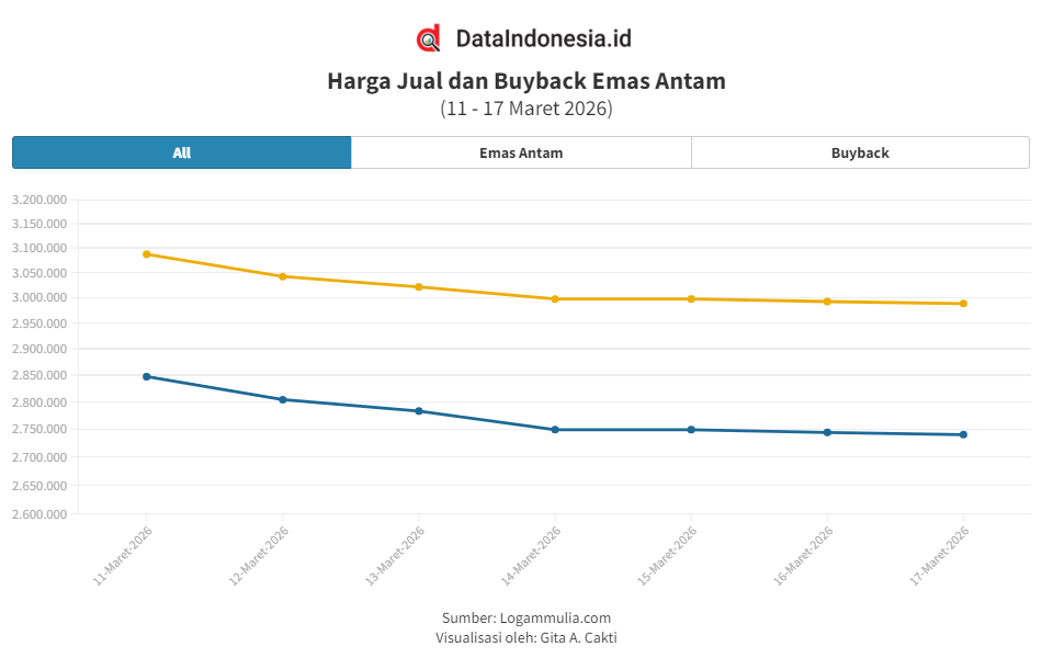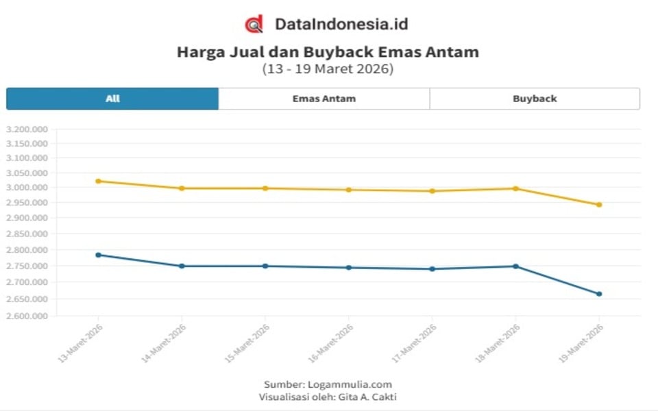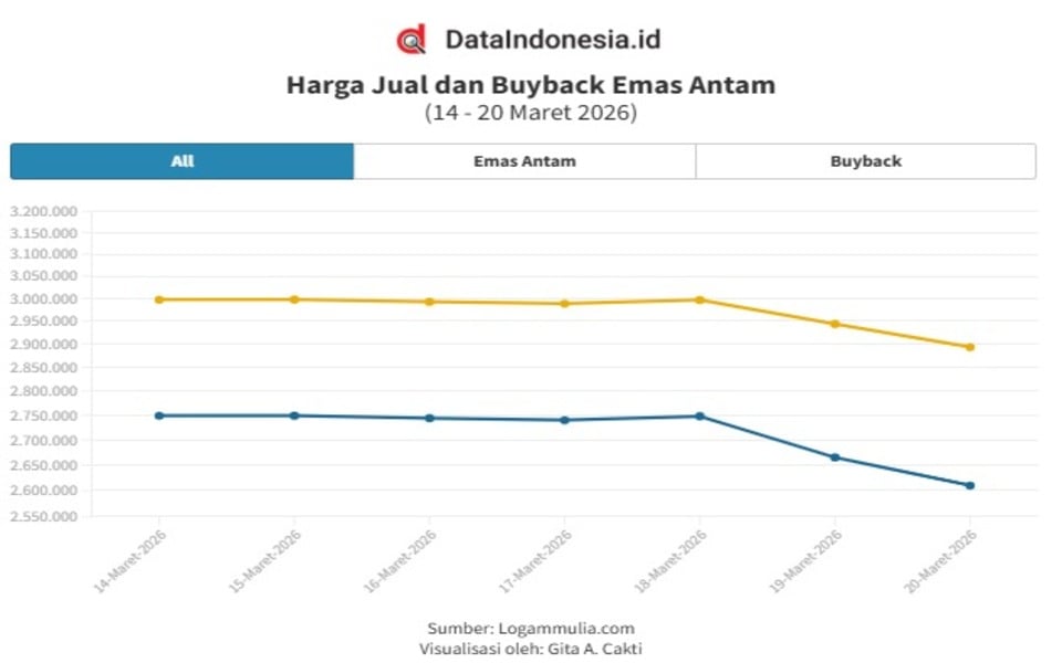 Harga jual emas Antam hari ini, Jumat (20/3), kembali turun Rp50.000 per gram. Harga buyback juga lebih murah Rp55.000 per gram. Artikel ini menyajikan grafik harga emas Antam hingga Jumat (20/3) serta rincian harga 0,5 gr–1 kg, baik harga dasar & +PPh 0,25%. Berikut rinciannya.